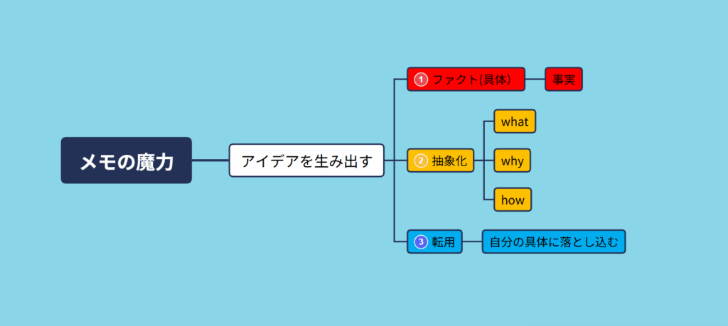 それが前田さんのメモ術――①ファクト(具体)→②抽象化→③転用――の三段階メモ。