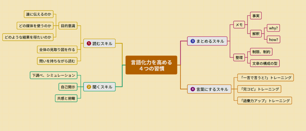 本書では、「読む・聞く・まとめる・言葉にする」という4つのスキルを、一連の習慣として捉えることの大切さが、繰り返し語られています。
